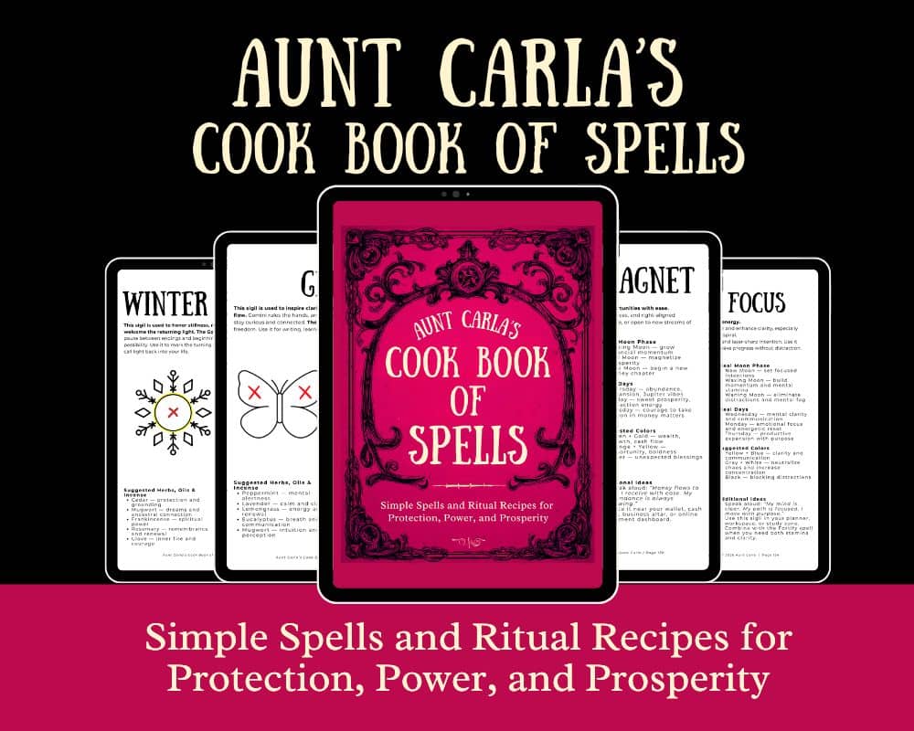 Hi Reader, Happy New Year! ⨠I wanted to pop into your inbox with a quick update about Aunt Carlaās Cook Book of Spells. Aunt Carla's Cook Book of Spells Since January 1st, Iāve added two brand new sigils to the eBook. The most recent one is called Wish Come Trueāand it came into being when I realized something kind of obvious (but somehow missing): I didnāt actually have a sigil for wish fulfillment. Not money.Not healing.Not protection. Just a clear, focused spell for a very specific desire...